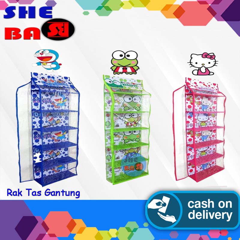 Rak Tas Gantung Karakter dengan 5 tempat tas menggunakan resleting.Motif ready saat ini :- HELLO KITTY : Pink- FROZEN : Biru ( kosong- DORAEMON : Biru- CARS : Merah ( kosong- KERO KEROPI : HijauNote : Dikarenakan Banyaknya permintaan pada Pabrik/Konveksi untuk Barang ini, kemungkinan Ada terlihat kelebihan benang pada Barang yg Akan diterima, Mohon jangan Di tarik Benang Jahitannya, Di Gunting Saja.#rakgantung #raktas #raktasgantung #rakkarakter #rakkartun #rakserba