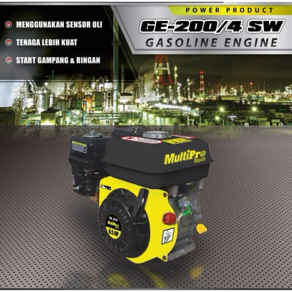 MultiPro Gasoline Engine GE-200-4 SW Spesifikasi Mesin :Engine Type : 4T Single Cylinder / OHVCooling System : Air CooledDisplacement : 196 cmFuel Tank : 3,5 LMax Output : 6,5 Hp / 4.000 r.p.mOil Capacity : 0,6 LStart System : Recoil (Manual)Ignition System : TCIOil Sensor : YesDimension : 376 x 308 x 353 mmNet Weight : 10,7 KgGross Weight : 11,8 KgFitur :- Menggunakan Sensor Oli- Tenaga Lebih Kuat - Start Gampang dan R