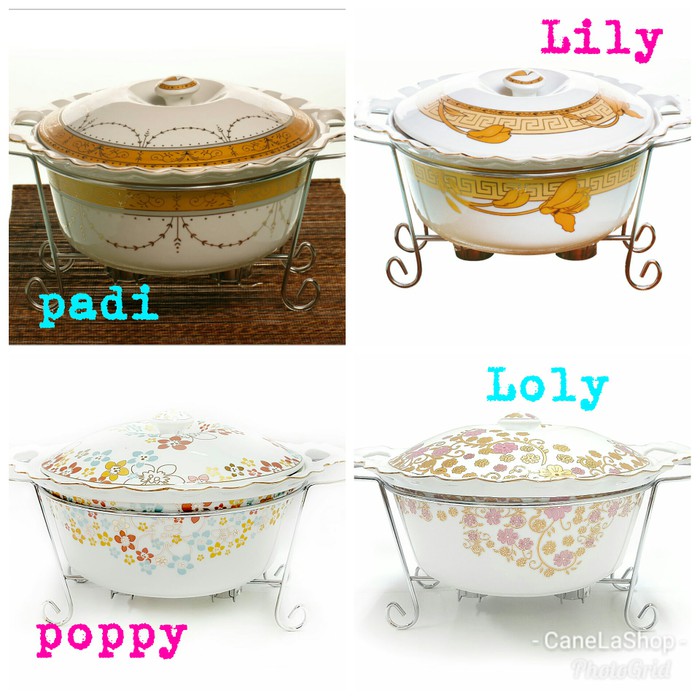 Wadah saji yang satu ini tampak terlihat sempurna nan anggun dalam menyajikan berbagai jenis makanan favorit Anda baik masakan berkuah maupun masakan kering. Dengan bentuk bulat yang terbuat dari porselin dan dilengkapi motif menawan, wadah saji ini sekaligus berfungsi menjaga makanan Anda tetap hangat dan higienis, karena terdapat tutup wadah yang cantik dan 2 buah lilin kecil sebagai penghantar panas. Sangat cocok digunakan sebagai wadah penyaji makanan dalam acara besar, acara keluarga, acara pesta ulang tahun maupun acara arisan. Ukuran 30 x 30 x 20 cm Catatan: silakan konfirmasi motif terlebih dahulu, jika tidak ada pilihan motif maka motif akan dikirim random/acak.Belanja Puas Hati Senang di Canela