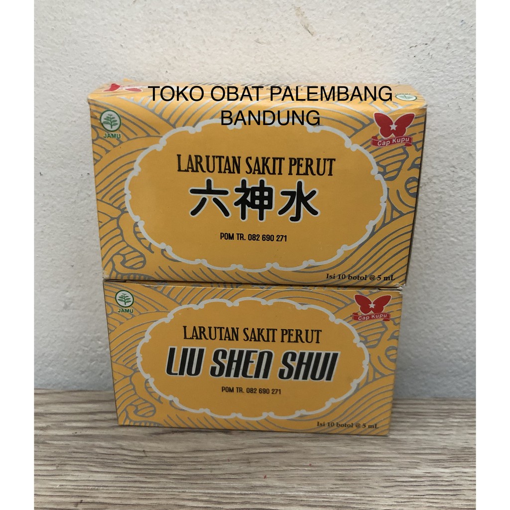 Penjelasan Singkat :- Membantu meredakan sakit perut- Membantu mengurangi frekuensi buang air besar- Membantu meredakan perut kembung- Membantu meredakan gejala masuk angin seperti pusing, mual, muntah, dllLiu Shen Shui (Larutan Sakit Perut) merupakan obat herbal tradisional yang digunakan untuk membantu mengurangi frekuensi buang air besar (diare), pusing, mual dan muntah, sakit perut, kembung, dan demam akibat masuk angin, serta efektif juga untuk meredakan sakit perut akibat asam lambung yang berlebih. [1]Liu Shen Shui (Sakit Perut) mengandung bahan-bahan herbal alami berkualitas yang dibuat secara ilmiah melalui proses ekstraksi dalam bentuk bubuk kemudian dilarutkan kedalam pelarut hingga larut menjadi larutan dan dikemas secara higenis dalam kemasan botol. Oleh karena itu, obat ini sangat mudah dan efektif untuk dikonsumsi oleh semua kalangan termasuk anak-anak diatas 5 tahun dan orang dewasa. Selain itu, obat ini juga sangat direkomendasikan sebagai obat yang harus selalu tersedia saat berada dirumah maupun saat bepergian. [2]Khasiat :Membantu mengurangi frekuensi buang air besar, pusing, mual karena masuk anginPerhatian :- Tidak boleh diberikan pada anak dibawah 5 tahun dan wanita hamil, penderita harus minum cairan pengganti elektrolit- Bila dalam penggunaan 3 hari tidak sembuh, hubungi dokter andaKomposisi :Zingiberis Rhizoma 273 mg, Rhei Radix 227 mg, Caryophylli Flos 136 mg, Anisi Stellati 91 mg, Burmanii Cortex 91 mg, Patchouli Herba 45 mgKemasan : Dus Isi 10 Botol @ 5 mLBrand : Cap Kupu
