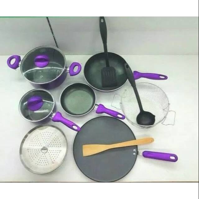 Cookware Set dari Supra Rosemary dilapisi bahan teflon anti lengket membuat memasak anda menjadi mudah dan menyenangkan.Isi :- 30cm Round Grill- 22cm Dutch Oven+Glass Lid- 16cm Sauce Pan+Glass Lid- 24cm Mini Wok- 18cm Fry Pan- 22cm Steamer Plate- 22cm Fryer- Nylon Spatula & Ladle - Wooden Sp